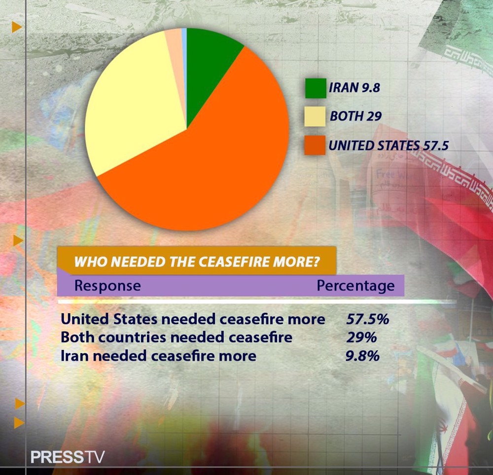 When asked which side needed the ceasefire more, the Iranian public delivered a clear verdict: 57.5 percent of respondents stated that the US needed it more than Iran. Only 9.8 percent said Iran needed it more, while 29 percent said both countries needed it.